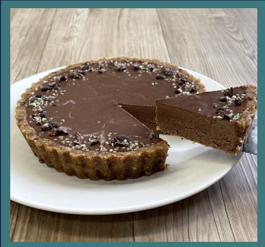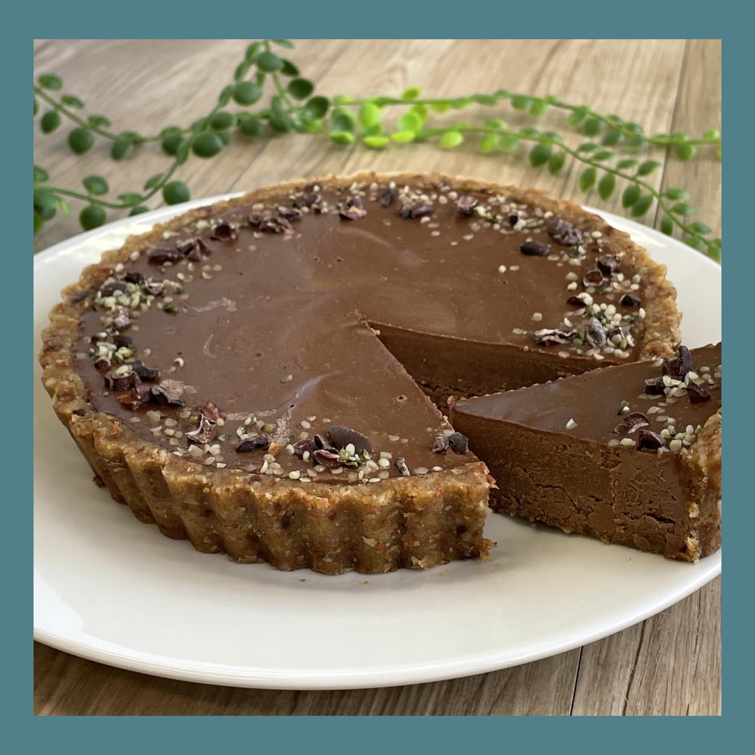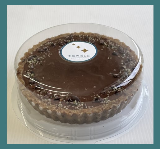 タルト部分は主に生アーモンドを使い、焼かずに作ります。フィリング部分は、生カシューナッツと生カカオパウダーをたっぷり使った、濃厚で滑らかな、大人のチョコレートケーキです。トッピングのカカオニブで、ザクザク感もお楽しみいただけます。